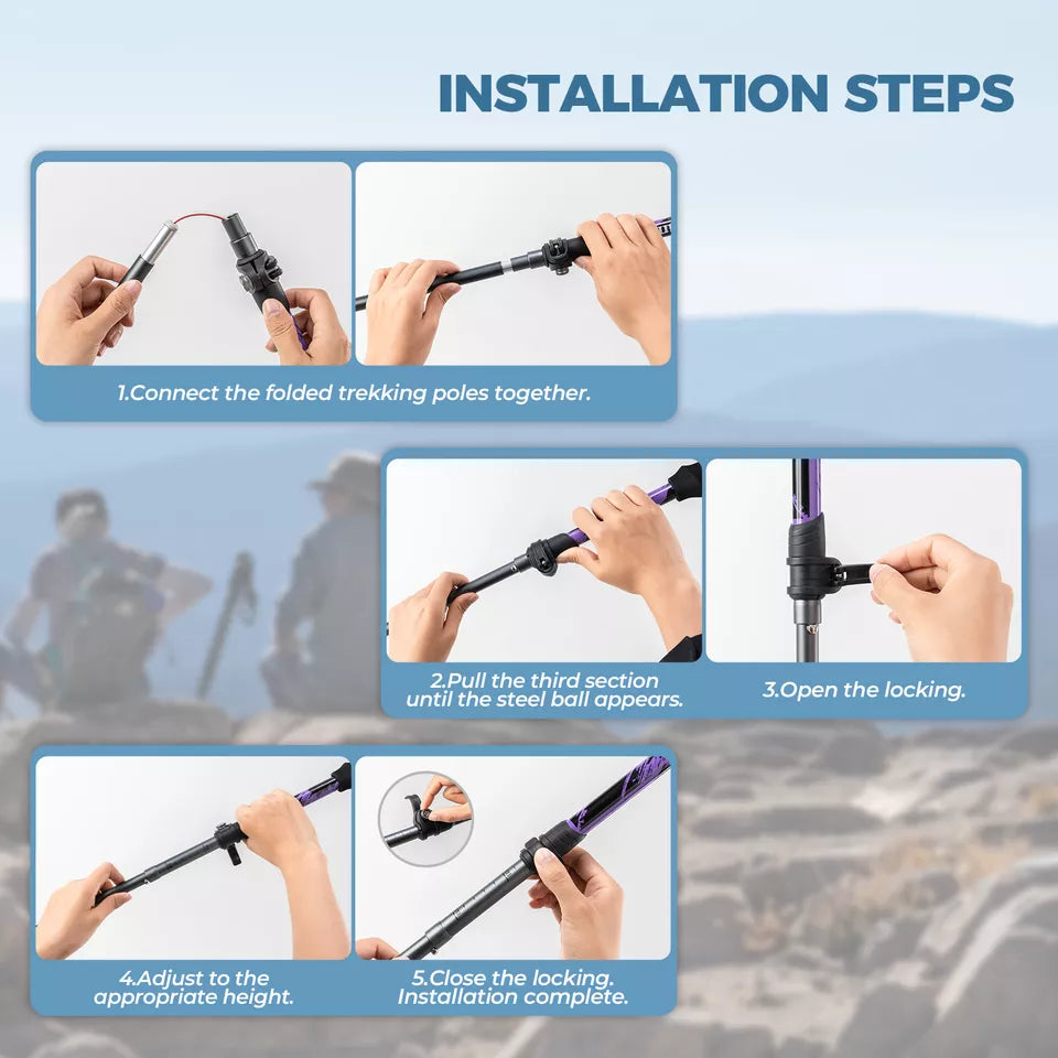 METTEZ DANS VOTRE SAC À DOS :Les bâtons de randonnée se replient pour atteindre une taille portable de seulement 34,5 cm et se glissent facilement dans votre sac à dos, votre valise ou votre sac de voyage pour un voyage compact ! Taille compacte pour que vous soyez toujours prêt à l'action ! La section en alliage d'aluminium est reliée à un câble en acier, robuste et non déformé.